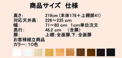【オプション加工】1.5cm棚板ピッチ、幅木よけ、(配線用)裏板穴加工、タフ棚板穴加工 等 ※幅違い・高さ違い・奥行違いは全サイズ別一覧よりお選び下さい 天井つっぱり全面扉書棚 タフ棚板(厚さ2.5cm) 奥行46cm×高さ226〜235cm×幅71〜80cm サイズオーダー ウッドラック 幅は1cm単位で指定 天井つっぱり全面扉書棚 本体高さ178cm 突張棚高さ41cm 本体扉高さ170.2cm(全面扉) 突張棚扉高さ45.4cm(全面扉) ご注意 オプション加工を選択されても価格が自動計算されません。